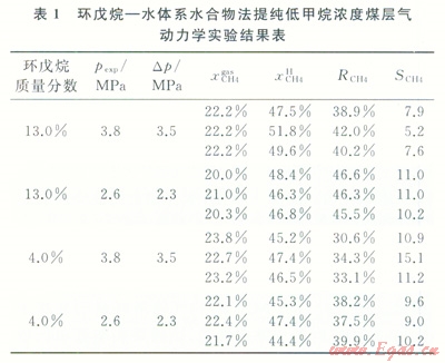 氣體水合物是一種非化學(xué)計(jì)量的結(jié)晶狀固體,客體分子(CH4、C2H6、CO2等)進(jìn)入由水分子形成的“籠”中,水分子通過氫鍵結(jié)合,而客體分子與水分子通過分子力結(jié)合。1m3氣體水合物能儲存標(biāo)準(zhǔn)狀況下150~180m3氣體。近年來,利用水合物方法分離提純低甲烷濃度煤層氣作為一項(xiàng)前沿性研究,受到國內(nèi)外研究者的廣泛關(guān)注[3-6]。與低溫精餾法、變壓吸附法和膜分離法相比,水合物法提純低甲烷濃度煤層氣具有儲氣率高、原料簡單、水合物分解水可循環(huán)利用等優(yōu)點(diǎn)[7-8],但是降低水合物生成的相平衡條件、縮短水合物結(jié)晶時(shí)間、提高CH4分離效率是水合物法分離低甲烷濃度煤層氣需解決的關(guān)鍵科學(xué)問題。熱力學(xué)促進(jìn)劑能有效縮短水合物結(jié)晶誘導(dǎo)時(shí)間,并改善水合物生成條件。趙建忠等[9]研究了十二烷基硫酸鈉(SDS)和四氫呋喃(THF)對水合物法提純低甲烷濃度煤層氣的影響,張保勇等[10-11]研究了SDS和高嶺土對瓦斯氣(39.8%CH4+50.1%N2+10.1%O2)水合過程的影響,并報(bào)道了CH4+N2+O2+THF+H2O體系水合相平衡數(shù)據(jù)。Zhong等人報(bào)道了四丁基溴化銨(TBAB)—水體系水合物法分離低甲烷濃度煤層氣的相平衡數(shù)據(jù)及分離特性,但CH4回收率偏低的問題尚未得到很好解決[4,12]?;谒衔餆崃W(xué)特性,筆者嘗試采用環(huán)戊烷(CP)作為熱力學(xué)促進(jìn)劑,研究低甲烷濃度煤層氣在環(huán)戊烷 水體系形成水合物的相平衡和反應(yīng)動力學(xué)特性,得出生長驅(qū)動力和環(huán)戊烷濃度對CH4回收率的作用規(guī)律,為水合物法提純低甲烷濃度煤層氣技術(shù)的發(fā)展提供基礎(chǔ)數(shù)據(jù)和實(shí)驗(yàn)依據(jù)。