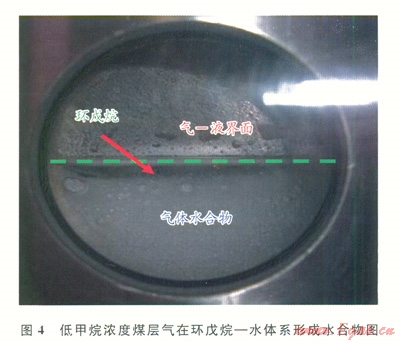 以壓差作為生長驅(qū)動力(Dp=pexp-peq),pexp為給定溫度條件下的實(shí)驗(yàn)壓力,peq為相同溫度條件下的水合物相平衡壓力。圖3給出了Dp=3.5MPa時(shí)低甲烷濃度煤層氣在13%CP溶液中生成氣體水合物的溫度及氣體消耗量變化情況。由圖3可見,水合物在236.3min時(shí)開始結(jié)晶,其氣相溫度突然升高,氣體消耗量從3.7×10-3mol快速增加到9.2×10-3mol。圖4為水合物在反應(yīng)器中的結(jié)晶生長情況,從上向下依次為低甲烷濃度煤層氣—環(huán)戊烷界面、環(huán)戊烷液體、氣體水合物。由圖4可見,水合物首先在環(huán)戊烷水界面結(jié)晶生長,然后在溶液中大量生成。