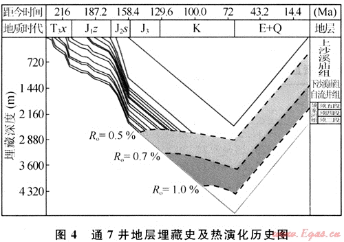 通過熱演化史的恢復(fù),可以分析烴源巖進(jìn)入生烴門限的時(shí)期,確定主要生烴時(shí)期。由于熱演化史主要決定于古地溫和受熱時(shí)間。因此,在熱演化史的恢復(fù)時(shí),首先要進(jìn)行古埋藏史恢復(fù),然后才能通過TTI值法計(jì)算熱演化史。根據(jù)鉆井地層分層資料和聲波測(cè)井資料,求出每一層在不同埋深下的厚度,恢復(fù)出通7井的地層埋藏史(圖4)。
