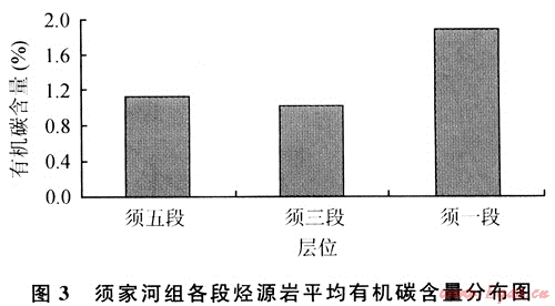 在分析的80個(gè)樣品中,有機(jī)碳含量的變化范圍為0.51%~7.12%,平均為1.47%。其中須一段有機(jī)碳含量為j.51%~7.12%,平均值1.87%;須三段為0.53%~1.80%,平均值1.02%;須五段為0.54%~2.48%,平均值1.12%(圖3)??梢钥闯鲰毤液咏M各層段烴源巖的平均有機(jī)碳含量都在生烴門限值以上,根據(jù)上述烴源巖有機(jī)碳豐度評(píng)價(jià)標(biāo)準(zhǔn),結(jié)合所分析的樣品來看,川中-川南過渡帶上三疊統(tǒng)須家河組烴源巖總體上屬于較好-中等烴源巖,具有一定的生烴物質(zhì)條件基礎(chǔ)。