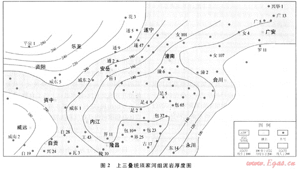 在川西金堂-彭縣-新津一帶,暗色泥巖厚度大(1000~1240m),最厚可逾1500m(隆豐1井),并央有煤層。往盆地的東南側(cè)為濱湖淺湖沼澤相區(qū),暗色泥巖減至100~300m,但煤層相對(duì)較發(fā)育。在川中地區(qū),煤層一般厚3m以上,具多層分布的特點(diǎn),層數(shù)多者可達(dá)數(shù)十層,單層厚度大者為1m左右,累計(jì)厚度超過25m。再往東南側(cè)則為三角洲平原-泛濫平原相區(qū),由于沉積相帶的變化,沉積物變粗,泥質(zhì)巖厚度明顯減薄,而且成煤條件也相對(duì)較差,所見煤層一般都很薄,總厚較小,多小于2.5m,局部?jī)H以煤線形式出現(xiàn),且橫向上分布不穩(wěn)定。由于沉積相帶的變化和沉積中心的遷移,上三疊統(tǒng)須家河組從盆地的西北到東南層段也在發(fā)生變化。研究區(qū)內(nèi)上三疊統(tǒng)須家河組泥巖厚度變化很大,從100~300m,最大厚度在平泉1井,總的變化趨勢(shì)是從西北到東南,厚度逐漸減小(圖2),但各層厚度相差較大,分布范圍也不一致。