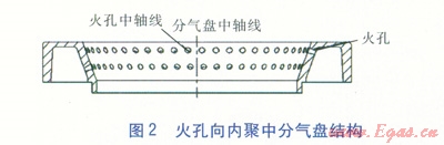 改變原來的火孔向外散開分氣盤結構,將分氣盤設計成火孔向內(nèi)聚中分氣盤,即火孔分布在分氣盤內(nèi)側邊緣。在火孔排布時,分氣盤應采用上下兩排火孔,兩排火孔的中軸線均與分氣盤的中軸線錯開,且火孔中軸線與水平面成一定角度,這樣的火孔稱為旋火火孔。旋火火孔產(chǎn)生的火焰圍繞分氣盤的中軸線呈盤繞狀,比直火火孔(火孔的中軸線與分氣盤的中軸線相交)更能產(chǎn)生渦流形成負壓,卷入更多的二次空氣,加速燃氣與二次空氣的再混合,并推動高溫煙氣螺旋上升,燃燒更聚中、充分,增強了高溫煙氣與鍋底的熱交換,減少了熱損失,從而提高了熱效率?;鹂紫蛲馍㈤_分氣盤結構見圖1,火孔向內(nèi)聚中分氣盤結構見圖2。