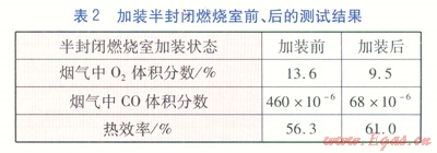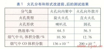 將傳統(tǒng)燃氣灶按照上述方法進行火孔分布和形式的改進,在鍋支架高度均為30mm、排煙間隙為30mm,未加裝半封閉燃燒室的情況下進行測試,改進前、后的測試結果見表1。在表1~4中,CO體積分數(shù)是指標準狀態(tài)下、過剩空氣系數(shù)為1時的折算值。