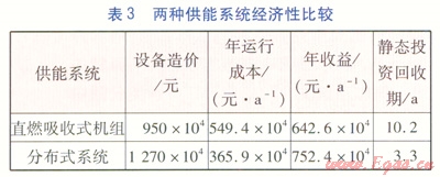 將兩種供能系統(tǒng)部分負荷運行時間折算成滿負荷運行時間,設定供冷期內(nèi)供能系統(tǒng)滿負荷運行時間為200d,供暖期供能系統(tǒng)滿負荷運行時間為30d。天然氣價格按3.79元/m3計算,電價按1.00元/(kW·h)計算,冷熱價均按100元/GJ計算。將年耗氣量、耗電量作為年運行成本,將年供冷量、供熱量、富裕發(fā)電量作為年收益。兩種供能系統(tǒng)的經(jīng)濟性比較見表3。由表3可知,在設定能源價格下,與直燃吸收式機組相比,分布式系統(tǒng)的年運行成本低,年收益高,靜態(tài)投資回收期僅為3.3a。