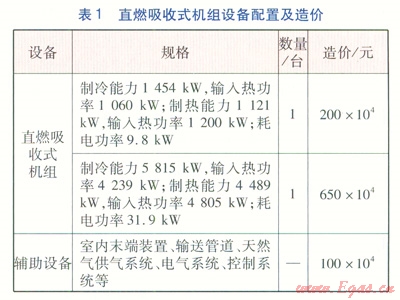 擬采用直燃型吸收機組、分布式系統(tǒng)分別為商業(yè)建筑供能??紤]到供冷期冷負荷較高,因此按50%的設計冷負荷(6500kW)作為設備選型依據(jù)。直燃吸收式機組、分布式系統(tǒng)設備配置及造價分別見表l、2。由表1可知,對于直燃吸收式機組,供冷期運行2臺直燃吸收式機組(總供冷能力為7269kW),供暖期運行供熱能力為1454kW的直燃吸收式機組,其余冷熱負荷由輔助電驅(qū)動熱泵空調(diào)設備承擔。由表2可知,對于分布式系統(tǒng),供冷期運行2臺煙氣熱水型吸收式機組及2臺離心式冷水機組(總供冷能力為7018kW),供暖期運行2臺煙氣熱水型吸收式機組(總供熱能力為1150kW),其余冷熱負荷由輔助電驅(qū)動熱泵空調(diào)設備承擔。