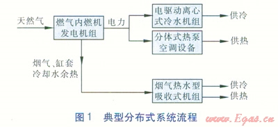 對于典型分布式系統(tǒng)(系統(tǒng)流程見圖1),燃氣內(nèi)燃機發(fā)電機組將天然氣燃燒產(chǎn)生的35%熱能轉(zhuǎn)化為電能,40%的熱能(以煙氣余熱、缸套冷卻水余熱體現(xiàn))利用煙氣熱水型溴化鋰吸收式冷熱水機組(以下簡稱煙氣熱水型吸收式機組)進行供冷、供熱,剩余25%熱能隨煙氣排空。當煙氣熱水型吸收式機組無法滿足冷熱負荷時,采用電驅(qū)動離心式水冷機組供冷,分體式熱泵空調(diào)設備供暖。設定電能全部用于電驅(qū)動空調(diào)設備制冷及制熱,離心式冷水機組的制冷系數(shù)取4.5,分體式熱泵空調(diào)的制熱系數(shù)取3.5,則可分別獲得158%的冷能及123%的熱能。設定煙氣熱水型吸收式機組的制冷系數(shù)為1.3、制熱系數(shù)為0.95,利用40%的天然氣燃燒熱能,可獲得52%的冷能及38%的熱能。