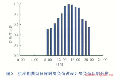 佛山地區(qū)某商業(yè)建筑總建筑面積約13×104m2,供冷期為4月至ll月,單位建筑面積冷負荷為100W/m2,供暖期為12月至次年1月,單位建筑面積熱負荷為15W/m2,工作時間為8:00—20:00。供冷期典型日逐時冷負荷占設計冷負荷比例分布見圖2,供暖期典型日逐時熱負荷占設計熱負荷比例分布見圖3。