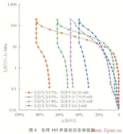 基巖儲層屬于雙重介質(zhì),29個巖樣的物性分析結(jié)果表明:基質(zhì)孔隙度介于1.2%~7.2%,平均為3.4%;滲透率介于0.054~0.91mD,平均為0.19mD,儲層致密。壓汞實(shí)驗(yàn)結(jié)果表明:基質(zhì)排驅(qū)壓力在7MPa以上,部分樣品推測受裂縫影響,沒有平直段,排驅(qū)壓力較低(圖4);進(jìn)汞飽和度介于30%~80%。目前僅有4塊壓汞實(shí)驗(yàn)樣品,實(shí)驗(yàn)結(jié)果差異較大,也反映了基巖微觀非均質(zhì)性較強(qiáng),其礦物溶孔和裂縫的分布差異較大。