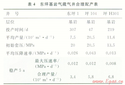東坪基巖氣藏試井測試資料少,但是部分氣井試采時間較長。因此在采用無阻流量法進(jìn)行合理配產(chǎn)分析的同時,運(yùn)用壓降速率法來配產(chǎn)準(zhǔn)確率更高[6]。現(xiàn)有的產(chǎn)能試井資料表明:東坪基巖氣藏氣井無膽流量介于14.6×104~21.1×104m3/d,按照無阻流量的1/3配產(chǎn),氣井合理產(chǎn)能應(yīng)為5×104~7×104m3/d。