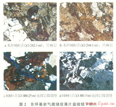 1)東坪1井區(qū):主要以花崗片麻巖為主。從巖心上可觀察到高角度裂縫發(fā)育,裂縫寬度為1~2mm,裂縫發(fā)育程度好。東坪103井井深3200m靠近基巖風(fēng)化殼,可觀察到風(fēng)化溶蝕孔洞(圖3),但總體上發(fā)育較少。巖心裂縫十分發(fā)育,多數(shù)巖心呈碎塊狀態(tài)。