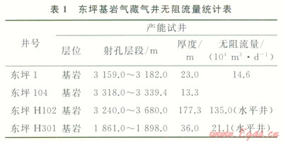 東坪1井區(qū)基巖層試采井有3口,實(shí)際單井日產(chǎn)氣12×104~18×104m3,壓降速率為0.026~0.038MPa/d。平均單井日產(chǎn)氣7.8×104~19.8×104m3,壓降速率0.016~0.029MPa/d。該井區(qū)基巖層試采產(chǎn)量較高,壓力高,也說明基巖儲層物性好。