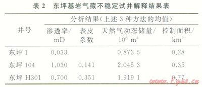 通過對3口井不穩(wěn)定試井解釋結(jié)果的統(tǒng)計(jì)表明(表2),各井控制儲量、控制面積、滲透性等在不同井段和井區(qū)差異較大,同樣說明基巖內(nèi)部的非均質(zhì)性較強(qiáng)。