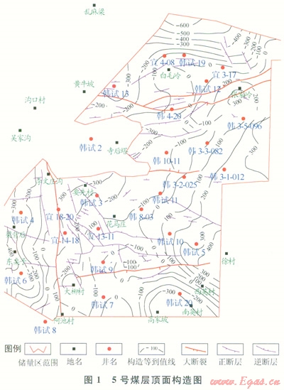 2)研究區(qū)5號煤層的排采出水量分析表明,近斷裂帶和構(gòu)造低幅度區(qū)排采出水量較大,遠(yuǎn)離斷裂帶和構(gòu)造低幅度區(qū),但頂?shù)装迳皫r含水層也會致使排采出水量增大??傮w上呈現(xiàn)南部和北部及中部韓3-2-025井區(qū)出水量較大,沿?cái)嗔褞А?gòu)造低幅度區(qū)及頂?shù)装迳皫r區(qū)出水量較大,是排采的不利區(qū)域。