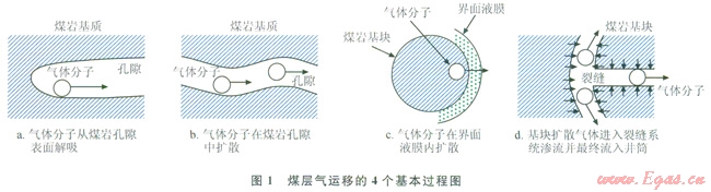 煤層氣的產(chǎn)出可以概括為3個(gè)過(guò)程:①從吸附態(tài)轉(zhuǎn)變?yōu)橛坞x態(tài)的解吸過(guò)程;②在濃度差、壓力差作用下氣體分子的擴(kuò)散過(guò)程;③擴(kuò)散氣體在煤巖儲(chǔ)層的裂縫系統(tǒng)滲流并最終流入井筒的過(guò)程。煤層氣的產(chǎn)出受解吸—擴(kuò)散—滲流過(guò)程的共同控制,3個(gè)環(huán)節(jié)緊密相連,相互影響,相互制約,任一過(guò)程受制,都將嚴(yán)重影響煤層甲烷的產(chǎn)出。筆者結(jié)合鉆井完井液作用對(duì)煤層氣運(yùn)移行為的影響,將煤層氣產(chǎn)出過(guò)程劃分為4個(gè)基本過(guò)程(圖1):①氣體分子從煤巖孔隙表面解吸;②氣體分子在煤巖孔隙中擴(kuò)散;③氣體分子在界面液膜內(nèi)擴(kuò)散;④基塊擴(kuò)散氣體進(jìn)入裂縫系統(tǒng)滲流并最終流入井筒。由此可見(jiàn),鉆井完井液與煤層相互接觸后固相和液相的侵入,不僅降低裂縫的滲流能力,而且亦會(huì)引起煤巖表面的物理化學(xué)作用導(dǎo)致煤層氣的解吸—擴(kuò)散能力的下降,從而影響煤層氣運(yùn)移的全過(guò)程。