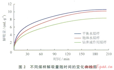 鉆井完井液濾液是一種化學(xué)成分比較復(fù)雜的流體,包含各種表面活性劑,煤層氣井鉆井過(guò)程中鉆井完井液濾液侵入后將與煤層發(fā)生物理化學(xué)作用,降低煤巖解吸能力進(jìn)而影響煤層氣產(chǎn)量,為考察現(xiàn)場(chǎng)用鉆井完井液體系對(duì)寧武盆地9號(hào)煤層解吸能力的影響,開(kāi)展了平衡水煤樣、飽和水煤樣和鉆井完井液處理煤樣的解吸實(shí)驗(yàn)。