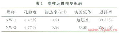煤巖具有高毛細(xì)管壓力特征,鉆井完井液濾液與煤層接觸后在毛細(xì)管力的作用下將發(fā)生毛細(xì)管自吸,使煤層含水飽和度增加,氣相滲透率降低,并導(dǎo)致后期排采作業(yè)中鉆井完井液濾液長(zhǎng)時(shí)間難以完全返排。為了掌握煤巖對(duì)鉆井完井液濾液的毛細(xì)管自吸特征,開(kāi)展了相同滲透率級(jí)別煤樣的地層水和鉆井完井液濾液毛細(xì)管自吸實(shí)驗(yàn)和模擬排采過(guò)程的氣驅(qū)水返排實(shí)驗(yàn)[14]。實(shí)驗(yàn)結(jié)果(圖3)表明,自吸曲線初始階段白吸速率很快,液相在毛細(xì)管力作用下迅速自吸進(jìn)入裂隙和大孔中,隨著時(shí)間的增長(zhǎng)白吸速率逐漸下降,液相以擴(kuò)散吸附的方式進(jìn)入微孔,相同時(shí)間內(nèi)鉆井完井液濾液的白吸量高于地層水的自吸量。通過(guò)氣相返排實(shí)驗(yàn)結(jié)果(圖3和表l)可以看出滲透率級(jí)別相近條件下地層水的返排率明顯高于鉆井完井液濾液的返排率,表明鉆井完井液濾液的吸附滯留將嚴(yán)重影響煤樣的返排能力,導(dǎo)致氣相滲透率的顯著降低。