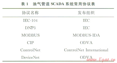 SCADA數(shù)據(jù)傳輸使用的通信協(xié)議,應(yīng)能保證數(shù)據(jù)在限定時間內(nèi)正確送達。根據(jù)美國燃氣協(xié)會(AGA)發(fā)布的AGA-12:1標準[6],SCADA系統(tǒng)中使用的協(xié)議有近200個,大都是由不同廠商研發(fā)提供的私有協(xié)議。經(jīng)過多年的發(fā)展,一些開放的標準協(xié)議在工業(yè)界得到廣泛應(yīng)用。表1中列舉了油氣管道SCADA系統(tǒng)中最常用的幾種標準協(xié)議。