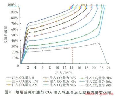 圖8表明:注入CO2后混合物體系液相體積減小,注入CO2所占摩爾含量越高,液相體積減小越多。當(dāng)CO2注入氣摩爾含量達(dá)到80%時(shí),在14.12MPa壓力下反凝析油液量體積收縮了約71%。而且,當(dāng)CO2注入氣摩爾含量在70%~80%時(shí),反凝析液量曲線出現(xiàn)了突變,反凝析液量變化趨勢由隨著壓力下降逐漸減小變化為隨著壓力下降先增加后減小的趨勢,表明當(dāng)CO2注入氣摩爾含量達(dá)到80%時(shí),反凝析油逐漸從輕質(zhì)凝析油體系轉(zhuǎn)變?yōu)閱蜗嗄鰵怏w系,這與圖6得出的結(jié)論一致,即當(dāng)CO2注入氣摩爾含量達(dá)到78.6%時(shí),CO2與地層反凝析油達(dá)到一次接觸混相,混相壓力為23.54MPa。綜合考慮該近臨界凝析氣藏地露壓差較大,目前該凝析氣藏的地層壓力下降較快,地層反凝析現(xiàn)象嚴(yán)重,有必要采取注氣的增產(chǎn)措施,降低凝析油的飽和度,有利于該凝析氣藏的高效開發(fā)。