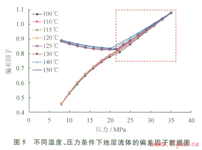 HC近臨界凝析氣藏的儲(chǔ)層溫度和壓力分別為130℃、35.2MPa。因此,為了研究該儲(chǔ)層流體樣品的相態(tài)變化特征,筆者選取了在溫度100~150℃、壓力8~35.2MPa的范圍內(nèi)進(jìn)行等組成膨脹實(shí)驗(yàn)研究,以研究該近臨界流體樣品在超臨界區(qū)和近臨界區(qū)的泡點(diǎn)或露點(diǎn)壓力、偏差因子、反凝析液量以及p-T相圖的變化規(guī)律。通過實(shí)驗(yàn)觀測到,溫度在120~125℃之間,近臨界溫度附近,很難觀測到第一個(gè)液滴或第一個(gè)氣泡,筆者把出現(xiàn)霧的壓力點(diǎn)暫且看作飽和壓力,并結(jié)合常規(guī)油氣藏相態(tài)實(shí)驗(yàn)中得出的液相體積在泡點(diǎn)壓力以下減少,在露點(diǎn)壓力以下增加結(jié)論,綜合判斷該點(diǎn)是泡點(diǎn)壓力還是露點(diǎn)壓力。從圖3可以看出:在120~125℃之間液相體積也從泡點(diǎn)壓力以下迅速減少的趨勢,變?yōu)槁饵c(diǎn)壓力以下迅速增加的趨勢。所以,得出儲(chǔ)層的臨界溫度點(diǎn)在120~125℃之間,然后,利用CMG相態(tài)模擬軟件中1978年改進(jìn)的PR狀態(tài)方程擬合實(shí)測的泡點(diǎn)或露點(diǎn)壓力,并得到完整的p-T相圖(圖4),并得到臨界點(diǎn)為l21.66℃、21.87MPa。不同溫度、壓力條件下地層流體的偏差因子如圖5所示。圖5虛線區(qū)域(100~150℃、大于21MPa)表明,此區(qū)域內(nèi)地層流體的偏差因子變化較??;溫度在100~150℃之間、壓力小于21MPa的條件下,偏差因子值發(fā)生了突變,臨界點(diǎn)處偏差因子值相等。而且,該地層流體所處的地層溫度、壓力點(diǎn)(130℃、35.2MPa)位于臨界點(diǎn)的右側(cè),且C7+的摩爾含量為l0.276%,可以判斷該流體樣品屬于近臨界超臨界態(tài)凝析氣藏。