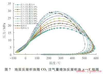 將做完等組成膨脹實(shí)驗(yàn)后的流體樣品加壓充分?jǐn)嚢韬螅o止2~3h。然后將地層流體在地層溫度(130℃)定容衰竭到目前地層壓力14.12MPa,并將最后一級(jí)的氣體全部排出,對剩余的凝析油做注CO2膨脹實(shí)驗(yàn)。這是針對注入CO2氣體與凝析油之間增溶過程相態(tài)配伍性的研究。圖6為衰竭開發(fā)到l4.12MPa下反凝析油飽和壓力隨CO2注氣量變化的p-T相圖,隨CO2注氣量增加凝析油飽和壓力逐漸增加,但增加的幅度不大,在CO2注入物質(zhì)的摩爾量濃度為50%時(shí),凝析油的飽和壓力為20.03MPa,目CO2與地層反凝析油達(dá)到一次接觸混相壓力需達(dá)23.54MPa。反凝析油隨CO2注氣量變化的p-T相圖和注入不同比例CO2反凝析液量隨壓力變化曲線見圖7、8。圖7表明,在地層溫度下,隨著CO2注氣量增加,反凝析油體系的飽和壓力增加,臨界點(diǎn)從右向左偏移,臨界溫度降低,臨界壓力增加,注CO2后混合物體系相圖向輕質(zhì)化特征轉(zhuǎn)變(向左收縮變窄)。