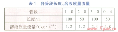 各管段長(zhǎng)度、溶液質(zhì)量流量見(jiàn)表1。設(shè)定節(jié)點(diǎn)1~3處溶液溫度均為60℃,管段1-0、2-0、3-0溶液質(zhì)量分?jǐn)?shù)分別為41%、38%、41%,環(huán)境溫度為5℃,各管段單位長(zhǎng)度散熱系數(shù)均取2W/(m·K)。