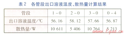 由單管溫降模型、單管散熱模型計(jì)算得到的各管段出口溶液溫度、散熱量見(jiàn)表2。由管網(wǎng)仿真模型計(jì)算得到節(jié)點(diǎn)0處溶液溫度為57.38℃,溶液質(zhì)量分?jǐn)?shù)為40.18%。