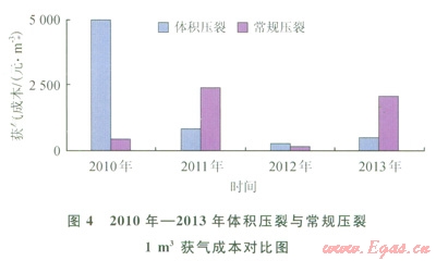 分析可知2010年—2013年體積壓裂每立方米獲氣成本呈下降趨勢(圖4),獲氣成本從2010年的4987元/m3下降到155元/m3,鉆井新工藝配套技術(shù)的完善與應(yīng)用,是體積壓裂獲氣成本下降的主要因素;常規(guī)壓裂獲氣成本隨機變化,主要決定因素在于油氣儲層本身的性能(儲量)。以上統(tǒng)計資料表明2010年—2013年體積壓裂總投資為179231萬元,總測試產(chǎn)量為497.63×104m3/d,平均獲氣成本為360.17元/m3;常規(guī)壓裂總投資為88392萬元,總測試產(chǎn)量為234.86×104m3/d,平均獲氣成本為376.36元/m3。