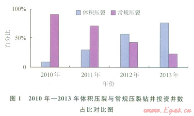 2010年—2013年蜀南氣礦在川南地區(qū)加砂壓裂鉆井累計測試產(chǎn)量732.49×104m3/d:其中體積壓裂獲取測試產(chǎn)量497.63×104m3/d,占比67.94%,常規(guī)壓裂獲取測試產(chǎn)量234.86×104m3/d,占比32.06%。在此期間,2010年測試產(chǎn)量39.82×104m3/d:其中體積壓裂1.08×104m3/d,占比2.79%,常規(guī)壓裂38.74×104m3/d,占比97.21%;2011年測試產(chǎn)量48.24×104m3/d:其中體積壓裂35.41×104m3/d,占比73.4%,常規(guī)壓裂12.83×104m3/d,占比26.6%;2012年測試產(chǎn)量498.89×104m3/d:其中體積壓裂322.52×104m3/d,占比64.65%,常規(guī)壓裂176.37×104m3/d,占比35.35%;2013年測試產(chǎn)量145.54×104m3/d:其中體積壓裂138.62×104m3/d,占比95.25%,常規(guī)壓裂6.92×104m3/d,占比4.75%,體積壓裂測試產(chǎn)量占比呈上升趨勢(圖3)。