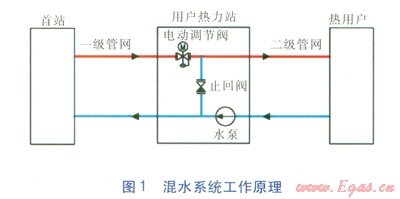 隨著能源和環(huán)境問題日益突出,節(jié)能和環(huán)保引起全球關(guān)注,成為人類社會生存和發(fā)展的兩大主題?;焖到y(tǒng)作為一種更加節(jié)能的供熱方案,得到了日益廣泛的應(yīng)用?;焖到y(tǒng)工作原理見圖1,將一級管網(wǎng)的高溫水和二級管網(wǎng)的低溫水在用戶熱力站不經(jīng)過換熱器按比例直接混合后供給熱用戶。