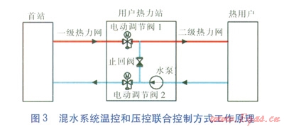 混水系統(tǒng)溫控和壓控聯(lián)合控制方式工作原理見圖3,在一級熱力管網(wǎng)供水管上設(shè)置壓力控制的電動調(diào)節(jié)閥1,在一級熱力管網(wǎng)回水管上設(shè)置溫度控制的電動調(diào)節(jié)閥2。壓力控制是通過檢測二級熱力管網(wǎng)回水壓力,來調(diào)節(jié)一級熱力管網(wǎng)供水管上的電動調(diào)節(jié)閥1開度,使二級熱力管網(wǎng)回水壓力滿足所供小區(qū)基本的定壓要求。當(dāng)二級熱力管網(wǎng)的回水壓力低于該用戶熱力站所需的定壓值時,電動調(diào)節(jié)閥1開度增大;當(dāng)二級熱力管網(wǎng)的回水壓力高于該用戶熱力站所需的定壓值時,電動調(diào)節(jié)閥1開度減小。溫度控制的電動調(diào)節(jié)閥2通過檢測二級熱力管網(wǎng)供水溫度是否滿足設(shè)定值來調(diào)節(jié)開度,當(dāng)二級熱力管網(wǎng)的供水溫度低于設(shè)定值時,增大電動調(diào)節(jié)閥2開度;反之,減小電動調(diào)節(jié)閥2開度。通過溫控和壓控聯(lián)合控制的方式,一方面穩(wěn)定了混水系統(tǒng)的壓力,杜絕氣體由于壓力波動而析出;另一方面也滿足了溫度控制的要求。