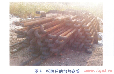 改變換熱器結構。由于蛇形加熱盤管不能采用機械通洗,只能通過酸洗工藝除垢,有很大的局限性。因此,擬將原加熱盤管改為浮頭式換熱器(換熱器可從爐內(nèi)抽出)。為避免清垢作業(yè)長時間影響正常生產(chǎn),將待清垢浮頭式換熱器抽出后,安裝備用浮頭式換熱器繼續(xù)生產(chǎn)。拆下的浮頭式換熱器可采用機械、化學的辦法清洗疏通。