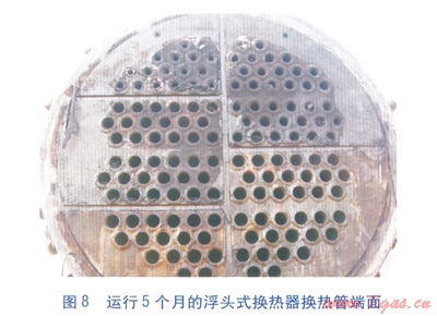 3臺摻水加熱爐于2012年10月陸續(xù)改造完成,并同期投產(chǎn)運行。改造后的3臺加熱爐運行情況基本平穩(wěn),直至2013年3月才陸續(xù)出現(xiàn)換熱效率低的現(xiàn)象。原加熱盤管基本兩個月就需要酸洗一次,酸液對金屬的腐蝕性強,易揮發(fā)產(chǎn)生酸霧污染原油,降低管道及設備的使用壽命[1]。而且隨著運行時間的延長,酸洗的次數(shù)增加,加熱盤管內(nèi)壁結垢傾向越來越嚴重,酸洗也變得無能為力。而改造后的浮頭換熱器能夠通過機械通洗繼續(xù)使用,清洗周期也比原加熱盤管有所延長。拆除后堵塞嚴重的加熱盤管見圖7,運行5個月的浮頭式換熱器換熱管端面見圖8。實踐充分證明,采用浮頭式換熱器替代蛇形加熱盤管,內(nèi)壁涂覆防垢涂層并提高摻水流速,有效地延緩了清洗時間。浮頭式換熱器可抽出,方便清洗,確保了原油正常生產(chǎn)。