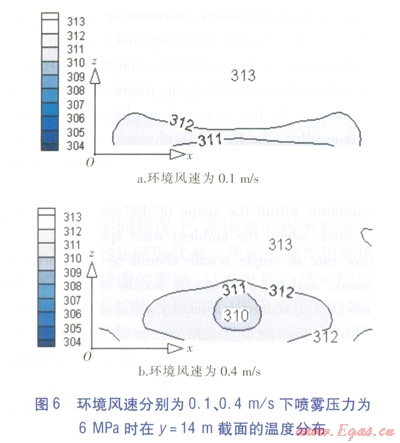 環(huán)境風(fēng)速分別為0.1、0.4m/s下,噴霧壓力為6MPa時在z=1.5m截面及y=14m截面的溫度分布見圖5、6。環(huán)境風(fēng)速為0.1m/s時,z=1.5m截面上降溫區(qū)域集中,其他區(qū)域降溫幅度僅0.5~1.0K,y=1.4m截面上空氣溫度幾乎沒有被影響。環(huán)境風(fēng)速為0.4m/s時,降溫1~2K的范圍變大,降溫區(qū)域分布更均勻,在y=14m截面上出現(xiàn)1~3K的溫降,并且處在人員可感知的高度上。