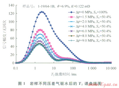 經(jīng)過(guò)成藏作用后,巖石孔隙中各類(lèi)孔、喉中均有水的賦存,其賦存狀態(tài)受控于孔喉大小、形狀以及巖石表面物理性質(zhì)等[12],對(duì)于氣藏儲(chǔ)層來(lái)說(shuō),一般在細(xì)小孔喉處賦存的水較多。通過(guò)巖樣飽和水后進(jìn)行氣驅(qū)水和核磁共振實(shí)驗(yàn),分析了登婁庫(kù)組巖石中水的賦存特征。巖樣含水飽和度為100%時(shí)測(cè)試的核磁共振T2譜曲線(xiàn)反映的是孔隙內(nèi)全部水體積,曲線(xiàn)下包面積代表了巖樣的全部孔隙體積。在不同壓差氣驅(qū)水后(氣驅(qū)水過(guò)程的驅(qū)替壓差由小到大逐步增加),巖樣達(dá)到不同含水飽和度,隨著氣驅(qū)壓差的增大,巖樣含水飽和度降低,T2譜曲線(xiàn)下降(圖1),相鄰T2譜曲線(xiàn)之間的面積代表了兩條曲線(xiàn)對(duì)應(yīng)驅(qū)替壓力變化所引起的可動(dòng)流體變化量,因此由相鄰T2譜曲線(xiàn)之間的面積分布及大小可看出可動(dòng)水來(lái)自哪些孔隙及總量多少[13]。