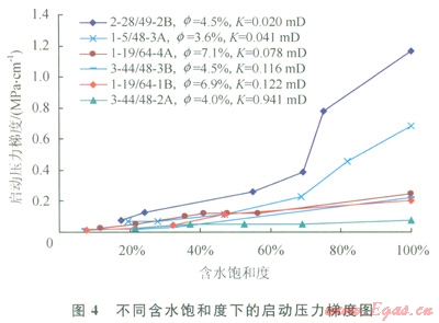 當(dāng)Sw/K小于1000mD-1時(shí),啟動(dòng)壓力梯度較低,當(dāng)Sw/K大于1000mD-1以后,啟動(dòng)壓力梯度顯著增大。因此,對(duì)致密氣藏來(lái)說(shuō),由于K值小,在較低的含水飽和度時(shí)就可能存在較大的啟動(dòng)壓力梯度,使致密氣藏在開(kāi)發(fā)過(guò)程中需要建立較大的壓差生產(chǎn),克服由毛細(xì)管壓力產(chǎn)生的氣體滲流阻力,儲(chǔ)層含水越高,氣體滲流能力越差,氣藏開(kāi)發(fā)越困難。