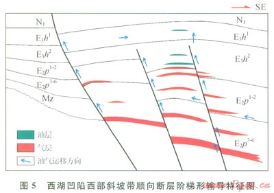 在中央反轉(zhuǎn)構(gòu)造帶南部花港組下段,近E—W向斷層與NE向斷層多有分布,2套斷層共存的過(guò)渡層段厚度可達(dá)1000m,既可以通過(guò)下部斷層作為油氣運(yùn)移通道獲得油氣,又可在上、下部斷層的末端,即應(yīng)力衰退區(qū)有利于油氣聚集成藏。幕式的斷層活動(dòng)或新的斷層活動(dòng),也提供了油氣從下部成熟烴源巖體中排出和運(yùn)移的動(dòng)力。