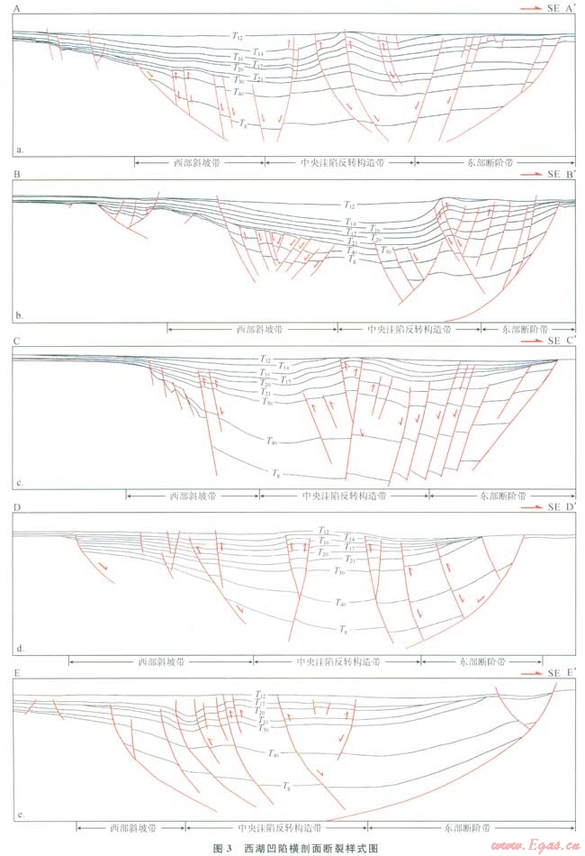 1)在斷裂空間分布上,西湖凹陷新生界發(fā)育下、中、上3個(gè)斷裂系統(tǒng):下部斷裂系統(tǒng)主要發(fā)育在古新統(tǒng)始新統(tǒng)構(gòu)造層,為基底卷入型張性正斷層;中部斷裂系統(tǒng)主要發(fā)育在漸新統(tǒng) 中下中新統(tǒng)構(gòu)造層,為擠壓型斷裂;上部斷裂系統(tǒng)主要發(fā)育在上中新統(tǒng)第四系構(gòu)造層,為張扭型斷裂,斷裂走向?yàn)榻?/span>E—W向。各層次斷裂系統(tǒng)中斷裂組合樣式具有顯著的差異:下部張性斷裂系統(tǒng)主要有斷階型、多米諾型、地塹、地壘等斷裂組合樣式,多與構(gòu)造部位有關(guān);中部壓性斷裂系統(tǒng)主要有正“Y”、反“Y”字形和簡(jiǎn)單后沖型斷裂組合樣式,多與其所處部位的反轉(zhuǎn)強(qiáng)度有關(guān);上部張剪性剖面上為懸掛斷裂,平面上呈條帶狀和雁行狀組合。