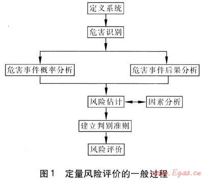 風(fēng)險(xiǎn)評(píng)價(jià)是以系統(tǒng)安全為目的,按照科學(xué)的程序和方法,對(duì)系統(tǒng)中的危險(xiǎn)因素、發(fā)生事故的可能性及損失與傷害程度進(jìn)行調(diào)查研究和分析論證,從而評(píng)價(jià)總體的安全性以及為制定基本預(yù)防和防護(hù)措施提供科學(xué)的依據(jù)[1]。風(fēng)險(xiǎn)評(píng)價(jià)按照定量的程度可以分為定性評(píng)價(jià)、半定量評(píng)價(jià)和定量評(píng)價(jià),定量風(fēng)險(xiǎn)評(píng)價(jià)是風(fēng)險(xiǎn)評(píng)價(jià)的高級(jí)階段。定量風(fēng)險(xiǎn)評(píng)價(jià)的一般過(guò)程見圖1[2]。