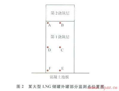 以山東某液化天然氣接收站的一個(gè)160000m3大型LNG儲(chǔ)罐混凝土外罐為例進(jìn)行數(shù)值計(jì)算,混凝土外罐內(nèi)徑為41m,外徑為41.8m,壁厚為0.8m,高為41.1m?;炷镣夤薹?/span>ll層進(jìn)行澆筑,其中1~9層澆筑高度為4m,第l0層澆筑高度為l.5m,第ll層環(huán)梁澆筑高度為2.6m,模板采用20mm膠合板,相鄰施工層時(shí)間間隔為4d。由于結(jié)構(gòu)的對(duì)稱(chēng)性,取罐壁的四分之一(相鄰扶壁柱之間部分)進(jìn)行有限元分析(圖1),外墻地板采用固定端約束,由于扶壁柱對(duì)外墻的約束,在其兩側(cè)面上施加對(duì)稱(chēng)彈性約束。監(jiān)測(cè)點(diǎn)分布位置如圖2所示。