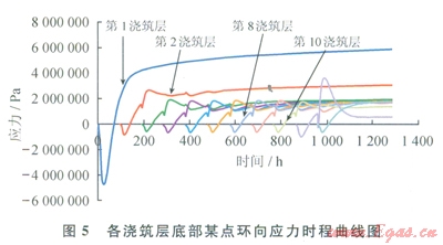 圖5為各澆筑層底部某點(diǎn)環(huán)向應(yīng)力時(shí)程曲線,圖6為部分澆筑層底部某點(diǎn)豎向應(yīng)力時(shí)程曲線。由圖5可知,在LNG儲(chǔ)罐外罐施工期間,溫度應(yīng)力分為壓應(yīng)力發(fā)展、壓應(yīng)力轉(zhuǎn)變?yōu)槔瓚?yīng)力及拉應(yīng)力趨于殘余應(yīng)力3個(gè)階段。比較圖5和圖6可知,混凝土外罐在溫度及重力荷載作用下,第一主應(yīng)力為環(huán)向應(yīng)力,與彈性力學(xué)理論分析的結(jié)果相符,而且現(xiàn)場(chǎng)施工經(jīng)驗(yàn)表明混凝土外罐在施工期間底部經(jīng)常產(chǎn)生豎向裂縫。由圖5還可知,第1澆筑層所受的溫度應(yīng)力明顯大于其他澆筑層,產(chǎn)生這種狀況的原因是第1澆筑層混凝土受到罐底的約束度相對(duì)較大;因第3~9澆筑層澆筑高度及約束狀況相近,所以其應(yīng)力變化曲線相似;第10澆筑層環(huán)向應(yīng)力曲線因受環(huán)梁澆筑的影響而產(chǎn)生2MPa的應(yīng)力波動(dòng)。