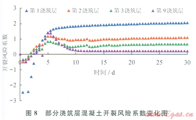 有限元分析時(shí),采用式(6)對(duì)各澆筑層裂縫開(kāi)裂情況進(jìn)行判斷,取1、2、3、9澆筑層外壁底部某點(diǎn)為監(jiān)測(cè)點(diǎn),各澆筑層在混凝土澆筑后開(kāi)裂風(fēng)險(xiǎn)系數(shù)變化如圖8所示,第l澆筑層的開(kāi)裂風(fēng)險(xiǎn)系數(shù)明顯大于1,將產(chǎn)生溫度裂縫;第2澆筑層開(kāi)裂風(fēng)險(xiǎn)系數(shù)接近0.8,混凝土具有產(chǎn)生溫度裂縫的危險(xiǎn);第9澆筑層受環(huán)梁澆筑影響,在混凝土澆筑5d時(shí)將產(chǎn)生溫度裂縫;其他澆筑層混凝土產(chǎn)生溫度裂縫的可能較小。由圖8還可知,各澆筑層在混凝土澆筑完成6d時(shí),混凝土的開(kāi)裂風(fēng)險(xiǎn)最大。