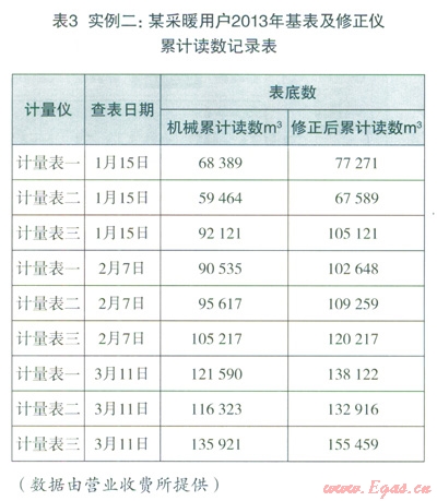 表3實(shí)例二采暖用戶2013年基表及修正儀累計(jì)湊數(shù)記錄表中,1月15日到3月ll日約2個月采暖區(qū)間(供暖期一般截止到3月15日),3臺計(jì)量表修正流量共計(jì)7651+8468+6538=22657m3,比不加體積修正儀流量體積多出14.7%按目前的采暖制冷價格2.67元/m3計(jì)算,此戶僅采暖季兩個月就增加氣費(fèi)收入60494元。