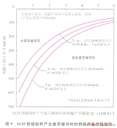 2010年的GB/T 24956~2010《石油天然氣工業(yè)鉆柱設計和操作限度的推薦作法》標準[9]中就曾給出井眼狗腿嚴重度和狗腿下的浮重對產(chǎn)生疲勞極限的線圖,其中S135鋼級幾種尺寸鉆具參考圖9。