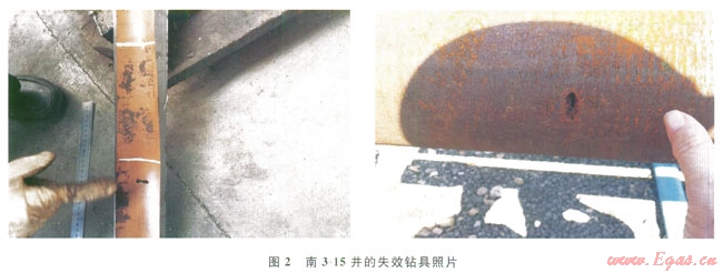 中國石油大慶鉆探工程公司(以下簡稱大慶鉆探)在冀東油田同時施工作業(yè)了4口井,分別使用同一廠家同批新鉆具,南3-15井[3]從201 3年7月1日起連續(xù)發(fā)生3起鉆具刺漏事件,刺漏位置均為母扣接頭以下0.4~0.6m的位置(圖2)。而其他3口井則沒有發(fā)生鉆具刺漏事件。其后技術(shù)交流過程中,廠商的解釋為井斜狗腿度偏大,而現(xiàn)場鉆井工程師卻列舉了一系列深井狗腿更大、使用同樣規(guī)格鉆具的其他廠家鉆具卻沒有發(fā)生失效,雙方對失效原因的認識無法達到基本一致。表3為該井的造斜段數(shù)據(jù)。