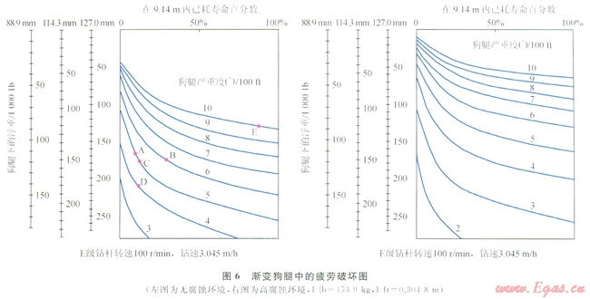 其后Hansford和Lubinski提出過一種簡易的方法來估算鉆桿通過狗腿段后的累積疲勞損傷,定制了腐蝕介質(zhì)和非腐蝕介質(zhì)中E級鉆桿在不同狗腿嚴重度和拉力下消耗的壽命[9](圖6,參見GB/T 24956—2010《石油天然氣工業(yè)鉆柱設計和操作限度的推薦作法》第68頁)。在不同轉(zhuǎn)速和鉆速情況下,可用下面公式進行校正。