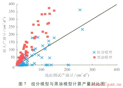 從所選的4個(gè)氣液兩相流模型(Hagedorn&Brown、Orkiszewski、Mukherjee&Brill、Hasan&Kabir)看,Hagedorn&Brown模型各項(xiàng)誤差最小,按組分模型計(jì)算的誤差明顯小于黑油模型。為了討論組分模型對(duì)流型、凝析油流量的影響,現(xiàn)選用誤差較小且考慮流型的Mukherjee&Brill進(jìn)行統(tǒng)計(jì)分析。分別按組分模型和黑油模型計(jì)算的井筒最大產(chǎn)油量如圖7所示,組分模型計(jì)算的井筒最大產(chǎn)油量明顯較地面測(cè)試產(chǎn)油量大得多,而按黑油模型計(jì)算的產(chǎn)油量明顯偏小,說(shuō)明隨井筒向上流動(dòng)過(guò)程中,壓力溫度降低導(dǎo)致了凝析油的析出,與實(shí)際情況一致;井筒流量的改變使流型發(fā)生明顯變化,黑油模型計(jì)算的井筒流型全部為段塞流,組分模型計(jì)算時(shí)井底高溫高壓凝析油未析出或析出較少,以純氣流、環(huán)霧流和段塞流為主,所占井次比例依次下降,而井口主要流型未變,但各流型的井次比例呈明顯的反比關(guān)系(圖8),使按組分模型計(jì)算的各項(xiàng)誤差明顯小于黑油模型。