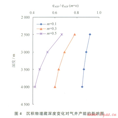 根據上覆壓力的經驗公式:pob=0.01[h水深+2.3(h中深-h水深)],計算出不同儲層埋深下的上覆壓力,再結合式(12)探討上覆壓力對產能的影響(圖4)。從圖4中可以看出:隨著沉積物埋藏深度增加,上覆壓力增大,應力敏感效應越嚴重,氣井產能損失越大。