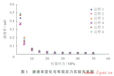 實驗結果如圖l所示,可見中新統(tǒng)黃流組儲層巖心對應力具有強敏感性,當有效應力小于10MPa時,隨著有效應力的增加儲層滲透率出現(xiàn)快速下降,即儲層應力敏感性強,滲透率傷害指數大;但隨著有效應力的進一步增加,儲層滲透率下降幅度出現(xiàn)降低,尤其當有效應力增大到15MPa后,儲層滲透率隨有效應力增加下降幅度將進一步減小,儲層應力敏感性較弱。