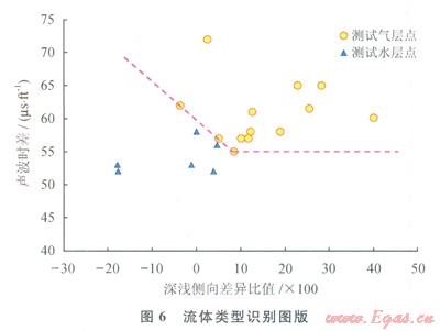 采用深、淺側向的差異同深電阻率的比值與聲波的交會圖來確定流體性質(圖6)。從圖6中看出氣層點都位于右上方,而水層點位于左下方,從測井的原理上看含氣好的層段深淺側向有較大的正差異特征或者小的負差異,而水層由于淡水鉆井液的侵入會使得電阻率出現(xiàn)負差異,當然裂縫的發(fā)育情況及產狀對電阻率的影響比較大,但從解釋結果看都是以網狀裂縫為主。因此認為電阻率的差異與流體類型存在一定的聯(lián)系。