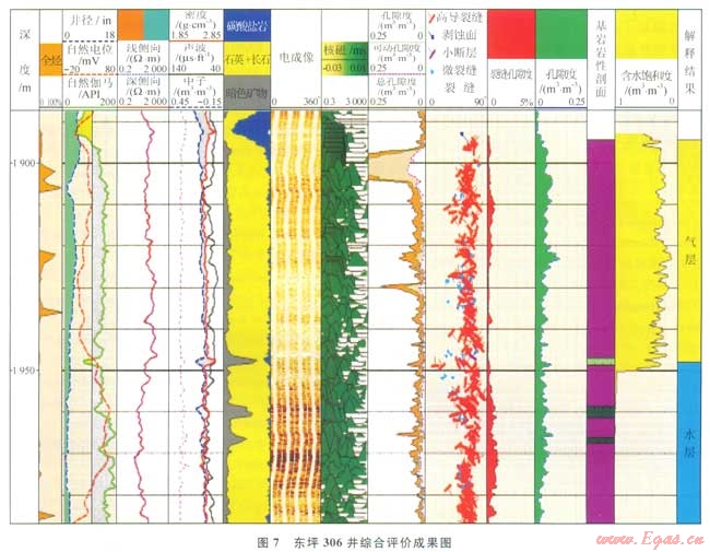 氣層與干層的確定是以孔隙度大大小進行劃分的。核磁資料表明當孔隙度為2%時,可動流體只有1%,同時參考了國內外眾多的古潛山油氣藏,以孔隙度2%作為有效儲層的下限。據前述方法對區(qū)塊內的井進行了綜合評價,如圖7所示為東坪306井的評價成果圖。該井1894.5m以下為花崗巖,電成像表明高導裂縫非常發(fā)育,裂縫孔隙度分布在0.05%~0.5%之間,總孔隙度為6.2%,計算的含氣飽和度為70%,深、淺側向有小的正差異氣測錄井顯示較好(中部因取心氣測低),解釋為氣層;下部巖性、物性與上部相當,但電阻率明顯降低,且深、淺側向基本重合,氣測無顯示,解釋為水層,據此確定了氣水界面。其數(shù)據為:井段1894.5~1950.0m,電阻率20~100W·m,核磁可動孔隙度3.2%,溶蝕孔隙度6.2%,裂縫走向NWSE,裂縫孔隙度0.02%~0.50%,含氣飽和度70%,解釋為氣層;井段1950.0~2097.3m,電阻率4~80W·m,核磁可動孔隙度1.5%,溶蝕孔隙度4.0%,裂縫走向NWSE,裂縫孔隙度0.05%~0.80%,含氣飽和度為0,解釋為水層。
